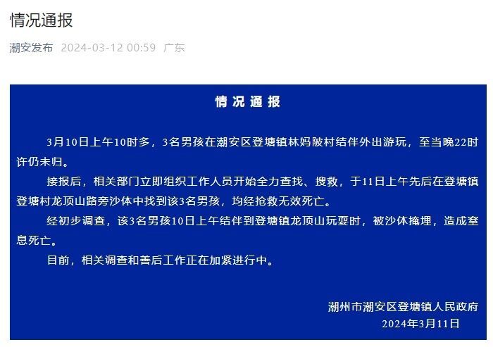央视网消息:据“潮安发布”公众号消息,潮州市潮安区登塘镇人民政府发布情况通报,3月10日上午10时多,3名男孩在潮安区登塘镇林妈陂村结伴外出游玩,至当晚22时许仍未归。