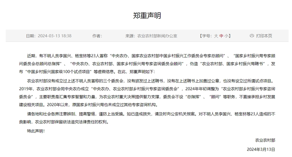 ·农业农村部郑重声明:没有成立过不明人员冒称的“中央农办、国家农业农村部中国乡村振兴工作委员会专家总顾问”、“国家乡村振兴局专家顾问委员会总顾问总指挥”、“中央农办、农业农村部、国家乡村振兴局专家咨询委员会顾问”三个委员会,没有颁发过上述聘书,没有在上述聘书上加盖过公章,也没有设立过所谓试点项目。