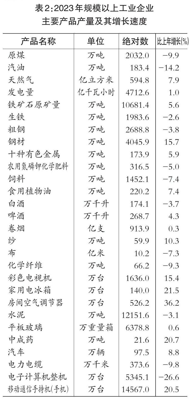 从主要产品产量看,原煤产量比上年下降9.9%,发电量增长1.0%,天然气增长7.9%,单晶硅增长113.2%,钢材增长15.7%,彩色电视机增长15.4%,汽车增长8.8%,啤酒增长4.3%。全年规模以上工业企业产销率为95.2%。