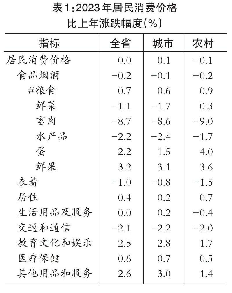 全年居民消费价格与上年持平,其中,医疗保健类上涨0.6%,居住类上涨0.4%,教育文化和娱乐类上涨2.5%,食品烟酒类下降0.2%。工业生产者出厂价格比上年下降2.4%,其中生产资料价格下降3.0%,生活资料价格下降0.6%;工业生产者购进价格比上年下降2.9%。
