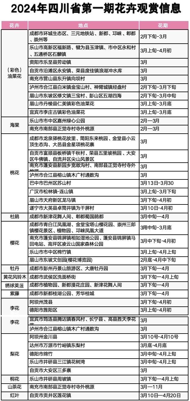 3月14日,记者从四川省林业和草原生态旅游发展中心获悉,伴随着即将到来的周末,2024年四川首期花卉观赏信息正式公布。总的来看,今年的春花,呈现出花种多、分布广等特点,赏花季将一直持续到四月中旬。目前,已有油菜花、桃花、樱花、李花等14种花卉进入最佳观赏期。