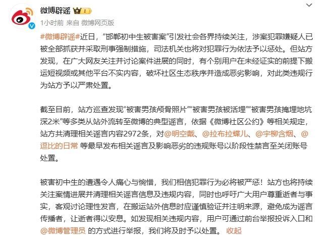 @微博辟谣 消息,近日,“邯郸初中生被害案”引发社会各界持续关注,涉案犯罪嫌疑人已被全部抓获并采取刑事强制措施,司法机关也将对犯罪行为依法予以惩处。但站方发现,在广大网友关注并讨论案件进展的同时,有个别用户在未经证实的前提下搬运短视频或其他平台不实内容,破坏社区生态秩序并造成恶劣影响,对此类违规行为站方予以严肃处置。