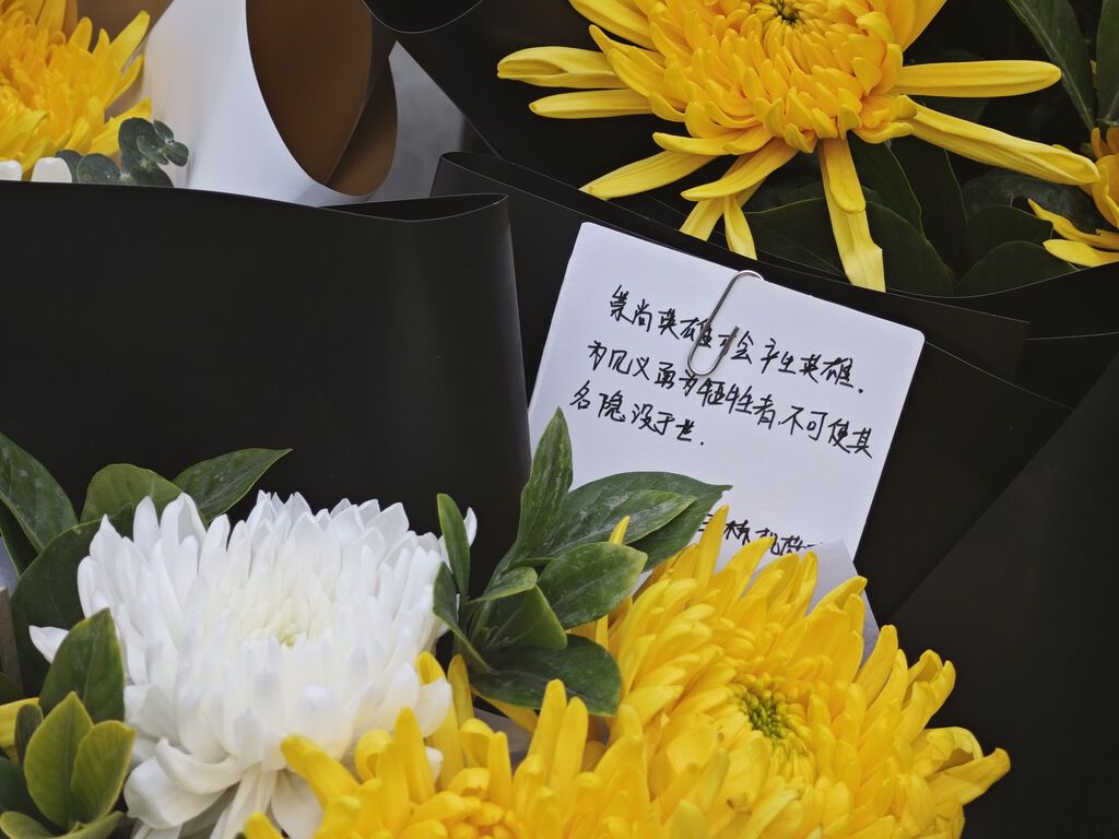 “李政 一路走好”“眉山人民为你点赞!”……一张张饱含真情的标签被夹在花束上,大家用这样的方式,送别勇敢的李政。