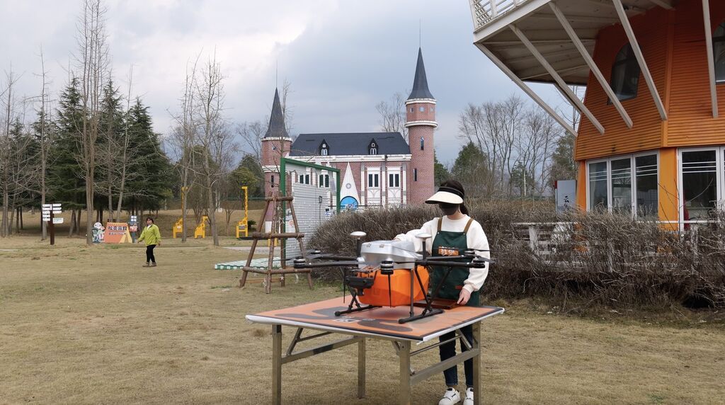 露营公园工作人员告诉记者,营地距离附近的美食集合地——雪山火锅城直线距离为2公里左右,但开车路程有近3公里,因此通过无人机配送能节约不少时间。