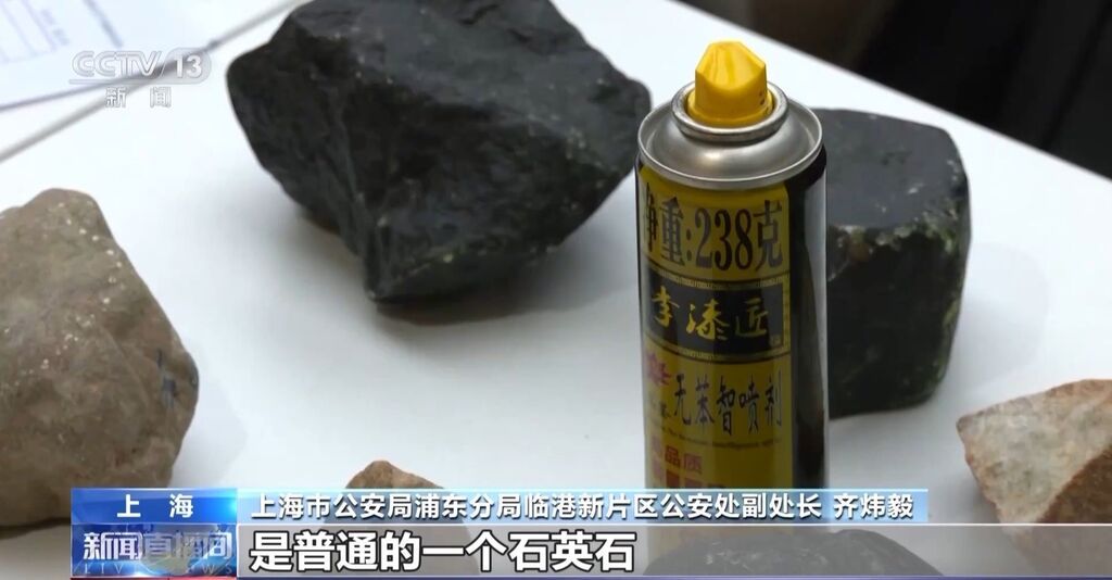 上海市公安局浦东分局临港新片区公安处副处长 齐炜毅:是普通的一个石英石,只不过经过石英石在他们直播间的光线也好,它的设计也好,包括加的一些滤镜也好,看上去有点像翡翠“原石”。