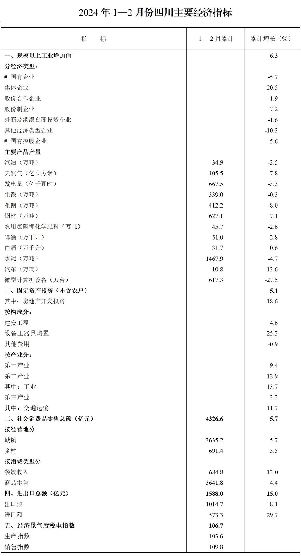 3月19日,四川省统计局发布今年1至2月四川省国民经济主要指标数据。数据显示,1—2月,全省规模以上工业增加值同比增长6.3%;全省实现社会消费品零售总额4326.6亿元,同比增长5.7%,经济运行起步平稳,延续了回升向好态势。