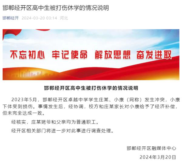 ·河北邯郸一学生被同学打伤睾丸休学,打人者自称姥爷是县长,当地通报。