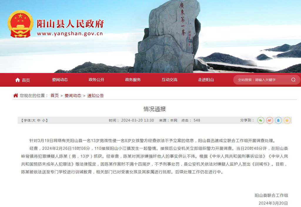 ·官方通报“13岁男孩性侵8岁女童警方不立案”:涉事男孩已被送至专门学校进行训诫教育。