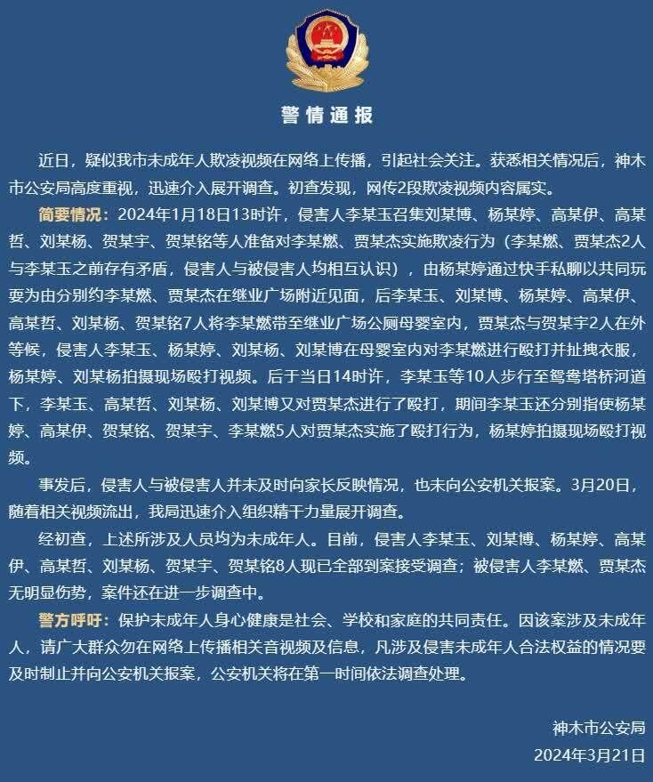 神木公安微信公众号发布警情通报,8名未成年人殴打2人,侵害人已全部到案。全文如下: