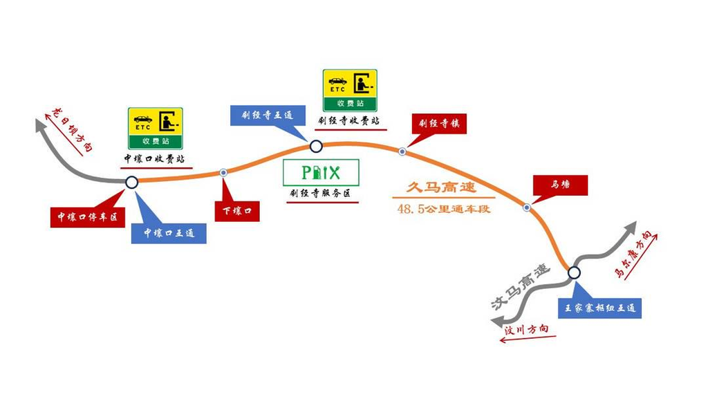 久马高速刷经寺通车段起于红原县壤口乡,经刷经寺镇、三家寨、与汶马高速王家寨枢纽互通相接,全长48.5公里,双向四车道,设计时速80公里。
