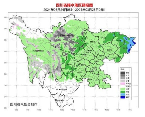 24日白天到晚上,盆地大部阴天有阵雨或雷雨,西部沿山和东北部部分地方有中雨,达州、巴中2市有大雨,个别暴雨;川西高原大部阴天间多云有阵雨(雪),局部中雨(雪),个别大雪,川西高原其余地方多云间阴;凉山州北部多云间阴天有分散阵雨,攀西地区其余地方多云间晴。24日盆地普遍有4—6级偏北风,山口河谷可达7级或以上。