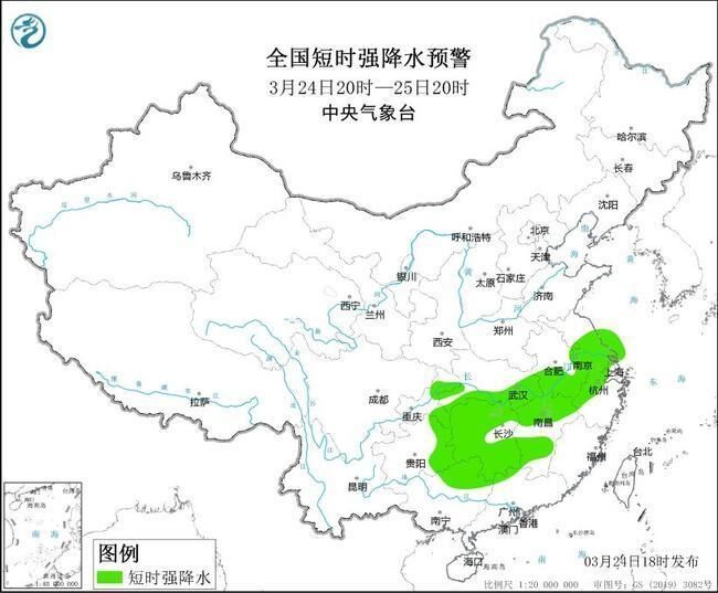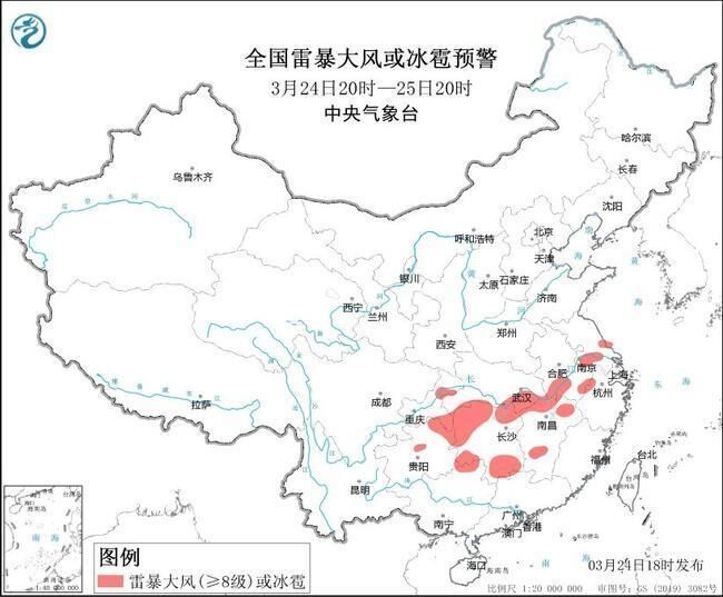 中央气象台3月24日18时继续发布强对流天气蓝色预警:预计3月24日20时至25日20时,安徽中南部、江苏中南部、湖北东部和南部、重庆东部、贵州东部、湖南北部和东南部、江西东北部和中南部、浙江西北部、广西东北部等地的部分地区将有8~10级雷暴大风或冰雹天气;安徽中南部、江苏中南部、上海北部和西部、湖北东部和南部、重庆东部、贵州东部、湖南、江西、浙江西北部、广西东北部、广东西北部等地的部分地区将有短时强降水天气,最大小时雨量20~40毫米,局地可达50毫米以上。