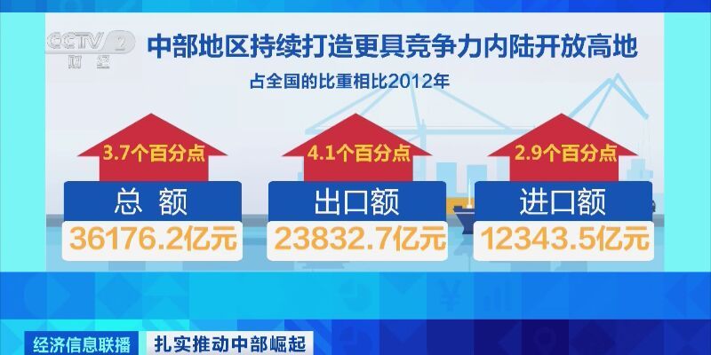 2023年,中部地区货物进出口总额36176.2亿元,出口额23832.7亿元,进口额12343.5亿元,占全国的比重相比2012年分别提高3.7个、4.1个和2.9个百分点。中部地区对外开放体制机制日渐完善,内陆开放型经济新体制基本形成。