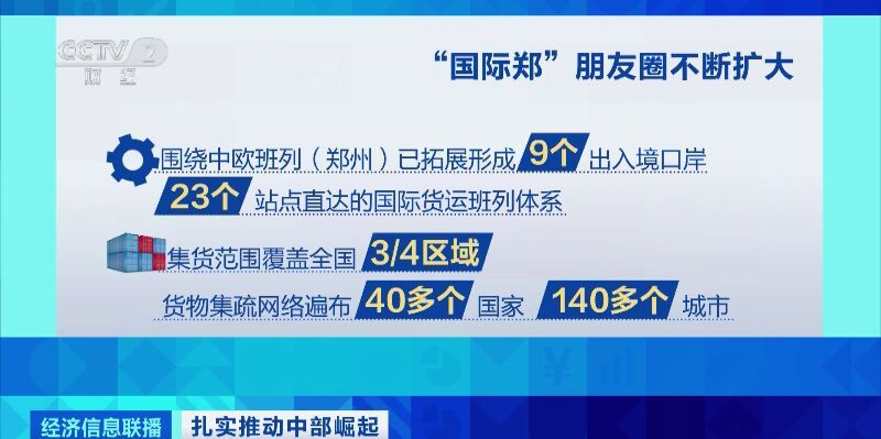 目前,围绕中欧班列(郑州)已拓展形成9个出入境口岸、23个站点直达的国际货运班列体系,集货范围覆盖全国四分之三区域,货物集疏网络遍布40多个国家、140多个城市。
