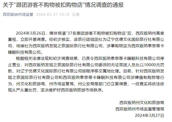 ·云南西双版纳通报“37名跟团游客不购物被扣购物店”调查情况:立案调查。