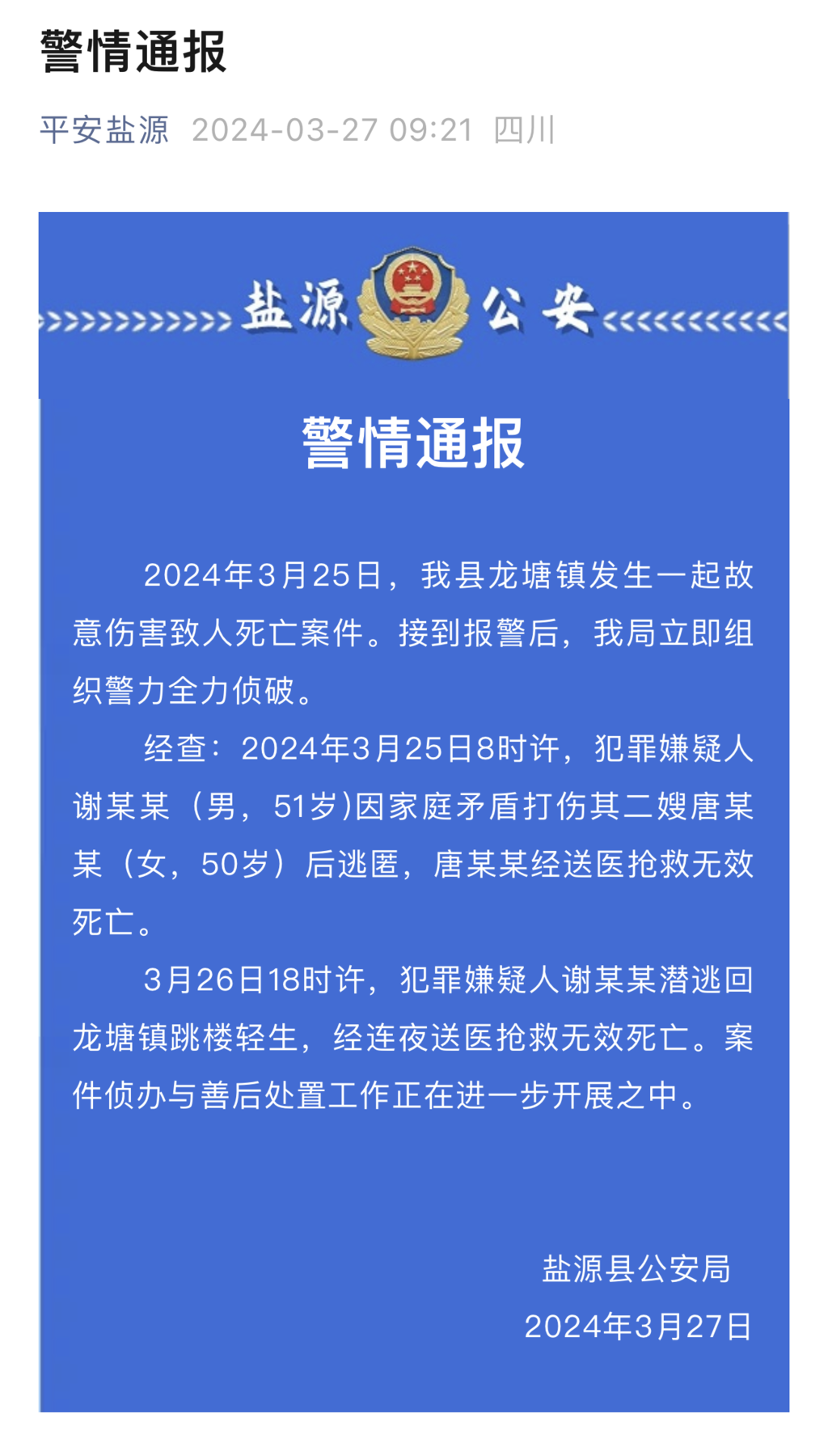 ·四川盐源警方通报,3月25日,该县龙塘镇发生一起故意伤害致人死亡案,谢某某(男,51岁)因家庭矛盾打伤其二嫂唐某某(女,50岁)后逃匿。26日晚,谢某某潜逃回龙塘镇跳楼轻生。两人经送医抢救无效死亡。