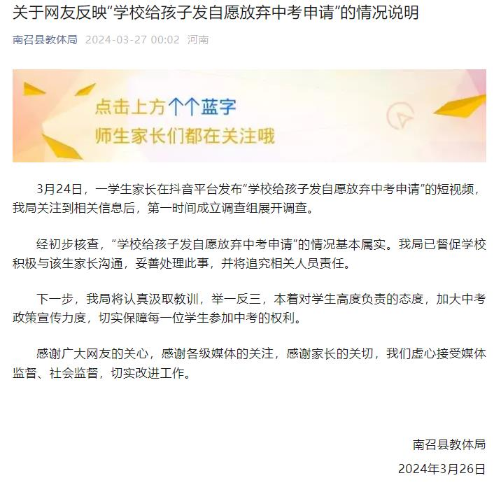 ·网传河南一学校劝学生自愿放弃中考,县教体局:基本属实,将追责。