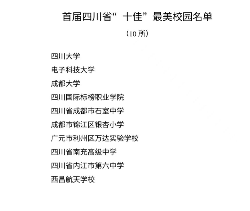 ·首届四川省“寻找最美校园”活动由四川省教育厅主办,旨在充分展示校园的自然之美、人文之美、发展之美,促进美丽文明校园建设。活动分中小学组和高校组,以基础条件、宣传教育、行为习惯、组织保障、校园文化、风貌塑造、卫生管理7个方面作为评选标准,经层层遴选推荐、直播展播、网络投票、专家评选等环节,最终评选出10所首届四川省“十佳”最美校园和90所首届四川省美丽校园。