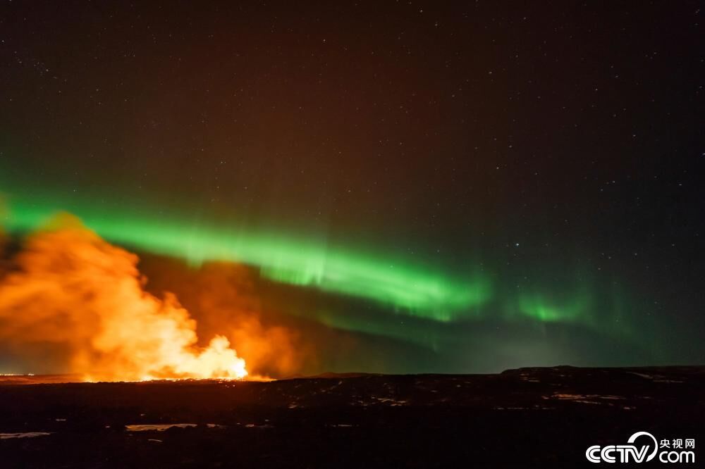 当地时间2024年3月28日,冰岛格林达维克,北极光在火山爆发区的天空中“翩翩起舞”。