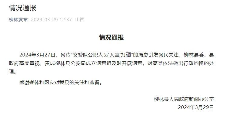 ·山西通报“交警队公职人员‘入室’打砸”:依法对高某行政拘留,成立调查组开展调查。
