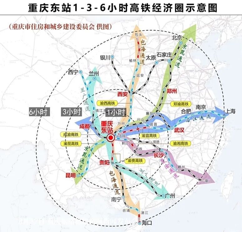 重庆东站开通后,将实现1小时直达成都、贵阳,3小时通达长沙、武汉、西安,6小时抵达北上广深。也就是说,未来成都到武汉、长沙,最快4小时可以到达。