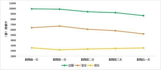 预计清明假期,普通公路日均断面交通量约9550辆,假期前一天与第一天交通量相对较高,随后有所下降。