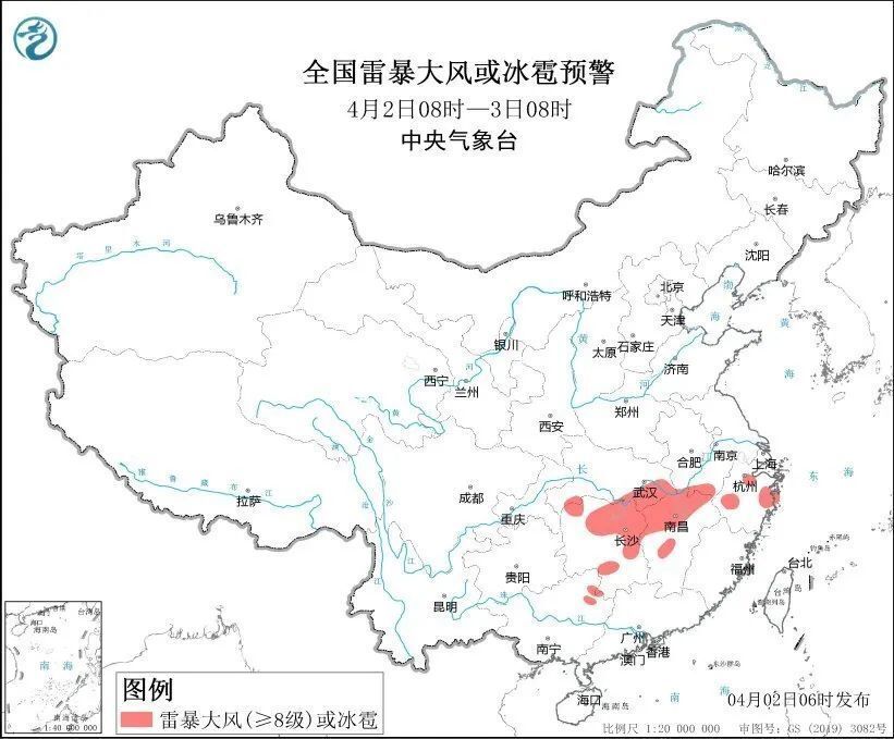 中央气象台4月2日06时继续发布强对流天气黄色预警:预计4月2日08时至3日08时,湖北南部、湖南中北部、江西中北部、浙江中东部、广西东北部等地的部分地区将有8-10级雷暴大风或冰雹天气,局地风力可达11级以上,冰雹直径可达2厘米;安徽中南部、江苏南部、上海北部、湖北东部和南部、湖南中北部、江西中北部、浙江西部和北部、福建西北部、重庆中东部、贵州东部、广西东北部等地的部分地区将有短时强降水天气,最大小时雨量30-50毫米,局地可达70毫米以上。
