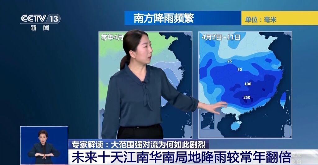 从明天开始,随着冷空气南下之后,冷暖空气交汇的重点的区域也会南压到江南南部的华南地区,而且这一带地区未来也是强降雨最集中的区域,所以从未来十天的预报来看,在江南南部以及华南北部一带地区累计降水量可能会达到100mm,甚至是250mm以上,相比较常年4月上旬将会偏多1到2倍。其实在刚刚过去的三月份,南方大部地区降水量都比常年同期明显偏少,未来集中增加的降水对于库塘蓄水是非常有帮助的,但是我们也需要提前防范降雨明显偏多可能会造成这些洪涝,还有农田积水等等的不利影响。