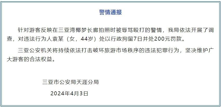 针对游客反映在三亚湾椰梦长廊拍照时被辱骂殴打事件,三亚市公安局天涯分局4月3日凌晨发布通报,违法行为人44岁女子袁某,被处以行政拘留7日并处200元罚款。