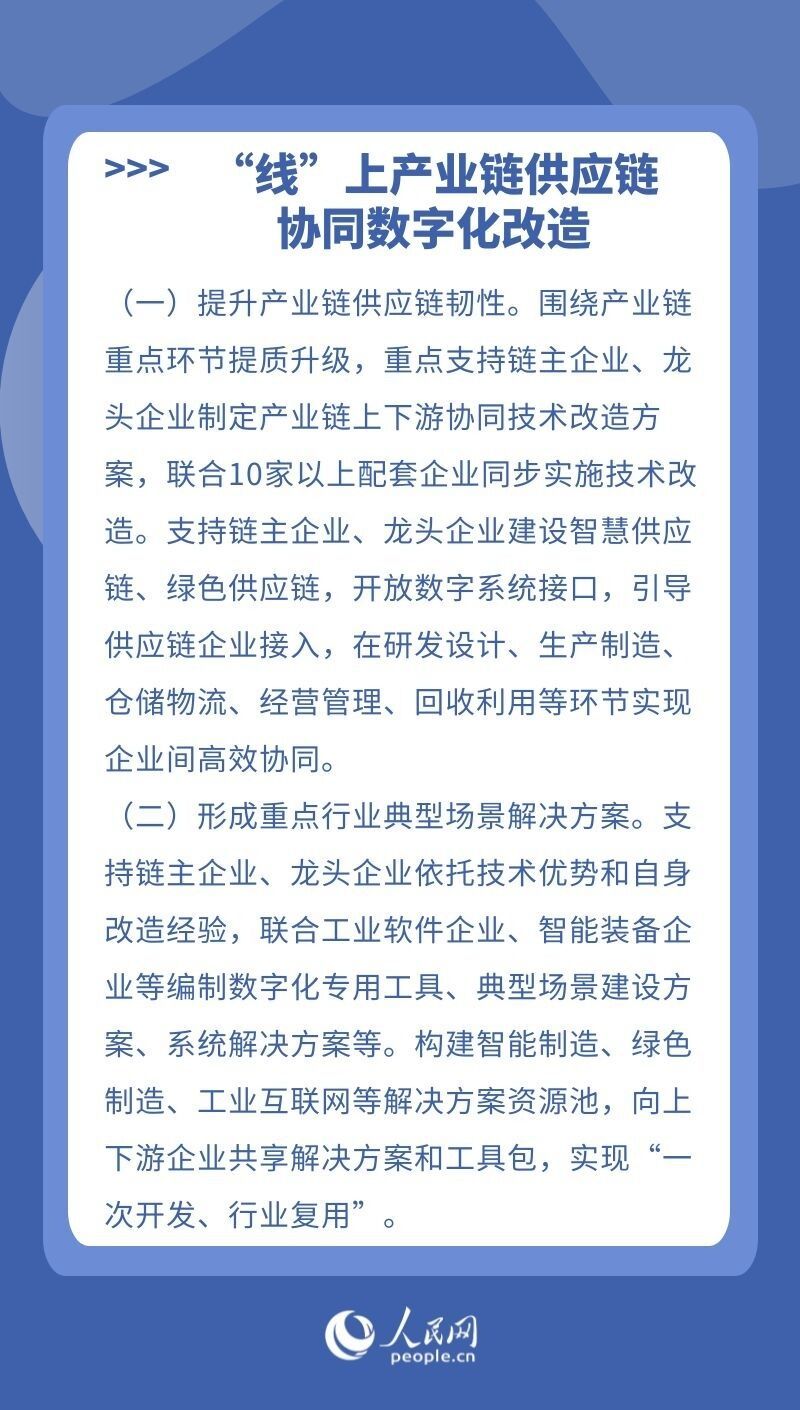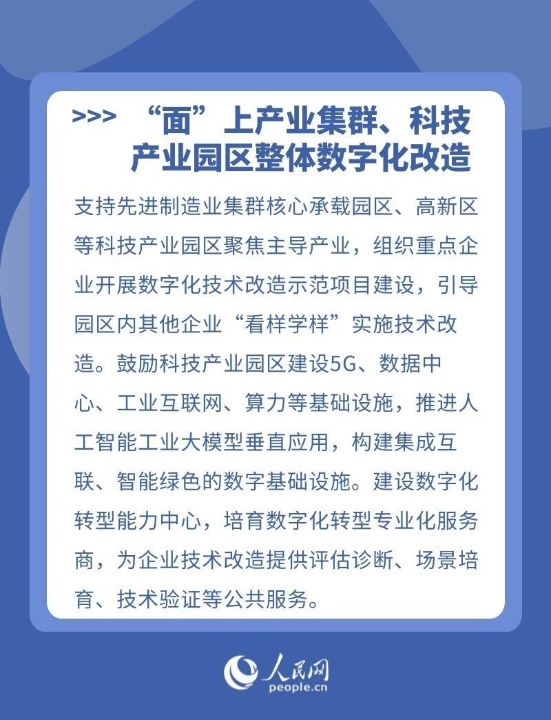 两部门介绍,“点线面”结合的方式,即“点”上开展数字化智能化改造示范、“线”上开展产业链供应链数字化协同改造示范、“面”上开展产业集群及科技产业园区数字化绿色化改造示范,加快数智技术、绿色技术以及创新产品推广应用。