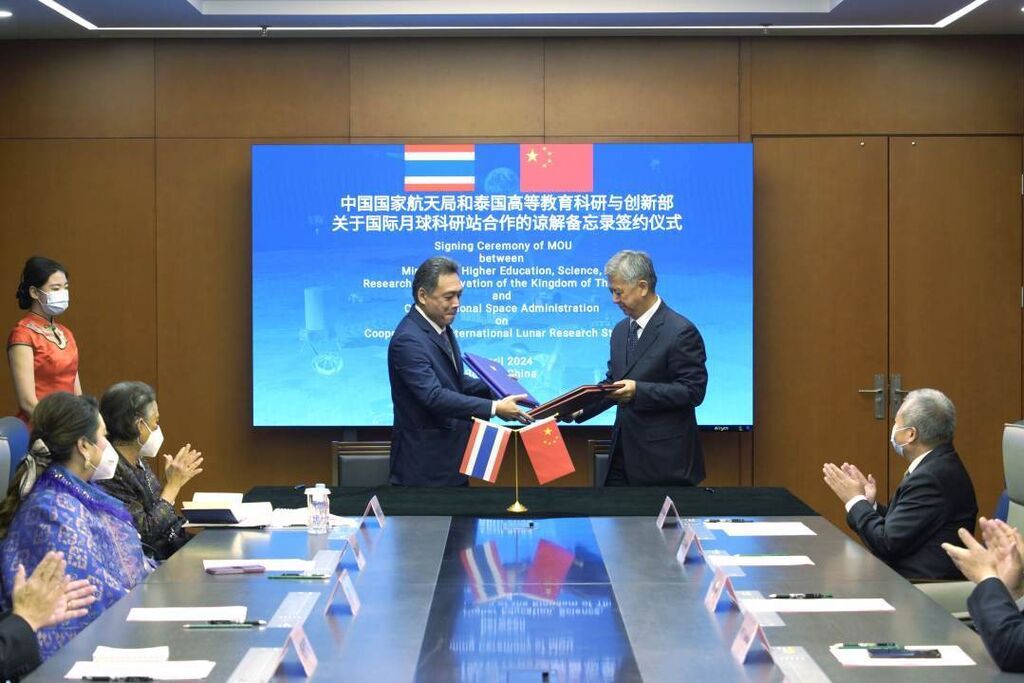 4月5日,中国国家航天局与泰国高等教育科研与创新部共同签署关于探索与和平利用外层空间合作的谅解备忘录和国际月球科研站合作的谅解备忘录。泰国公主诗琳通出席并见证签约,中国国家航天局局长张克俭致欢迎辞,泰国高教部部长苏帕马斯出席活动,中国国家航天局副局长徐占斌与泰国高教部常务秘书鹏术代表双方签署合作协议,中国国家航天局总工程师李国平参加活动。