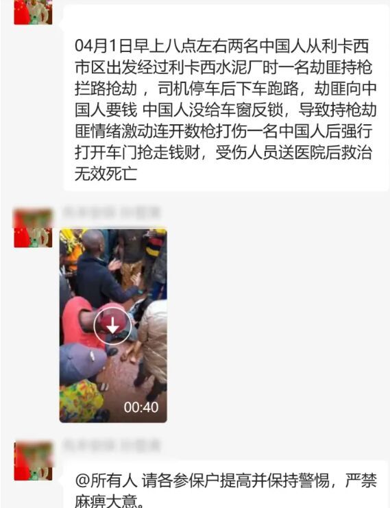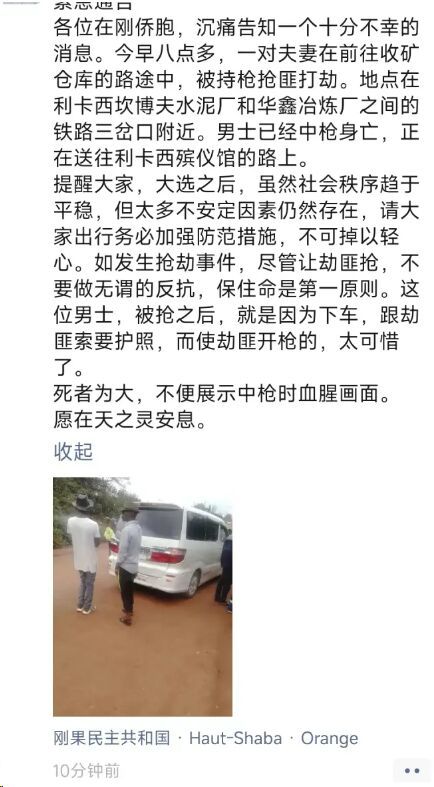 4月1日,有消息称非洲刚果(金)利卡西一对中国夫妇遭劫匪枪击,丈夫身亡。