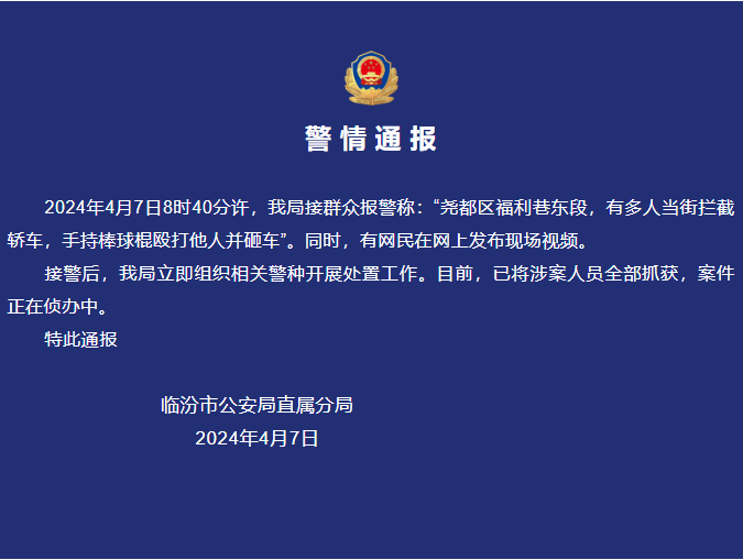 ·临汾警方通报多人持棒球棍殴打他人并砸车:涉案人员全部抓获。