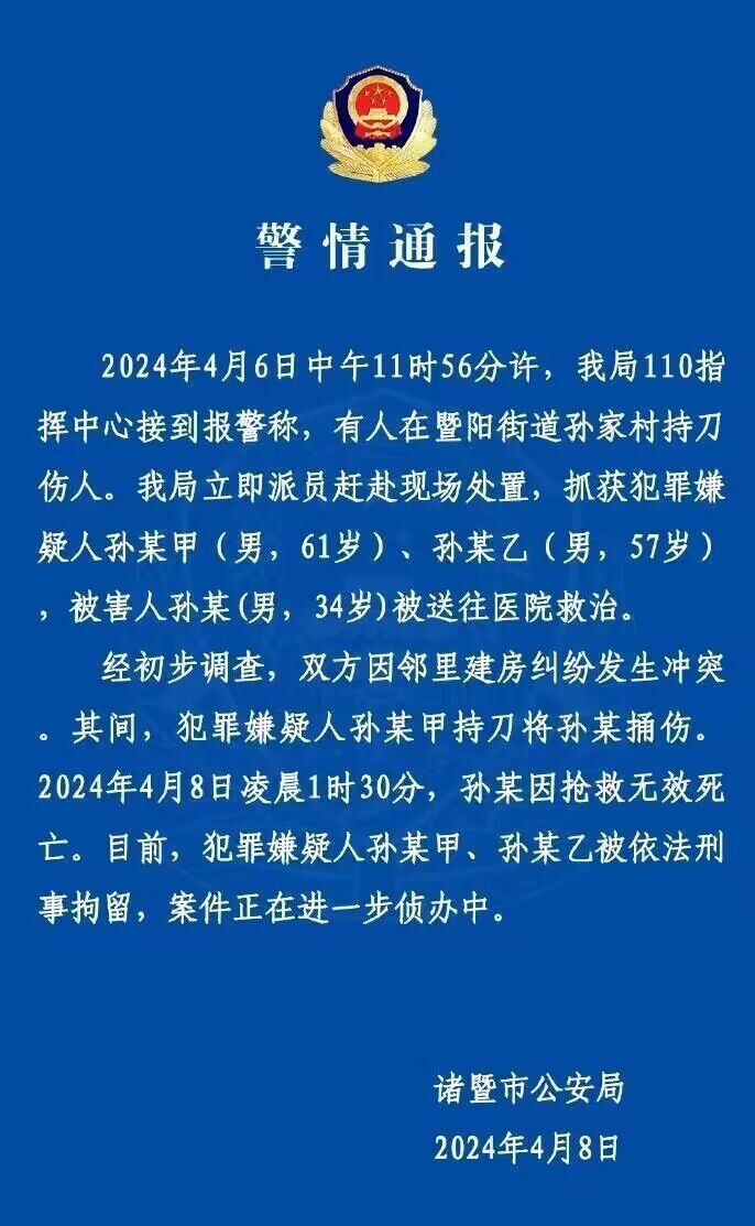 4月8日,浙江省诸暨市公安局发布警情通报。2024年4月6日中午11时56分许,我局110指挥中心接到报警称,有人在暨阳街道孙家村持刀伤人。我局立即派员赶赴现场处置,抓获犯罪嫌疑人孙某甲(男,61岁)、孙某乙(男,57岁)被害人孙某(男,34岁)被送往医院救治经初步调查,双方因邻里建房纠纷发生冲突,其间,犯罪嫌疑人孙某甲持刀将孙某捅伤。2024年4月8日凌晨1时30分,孙某因抢救无效死亡。目前,犯罪嫌疑人孙某甲、孙某乙被依法刑事拘留,案件正在进一步侦办中。