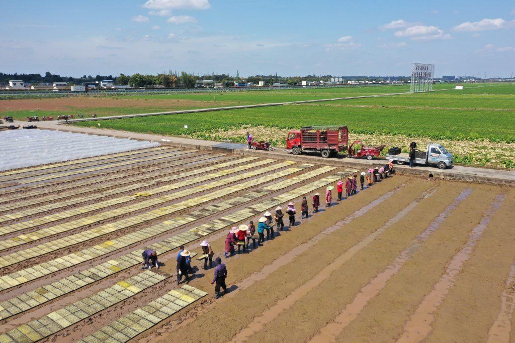 最近,在泸州市合江县白沙镇马鹿村,前期育好的水稻秧苗陆续栽插入田。