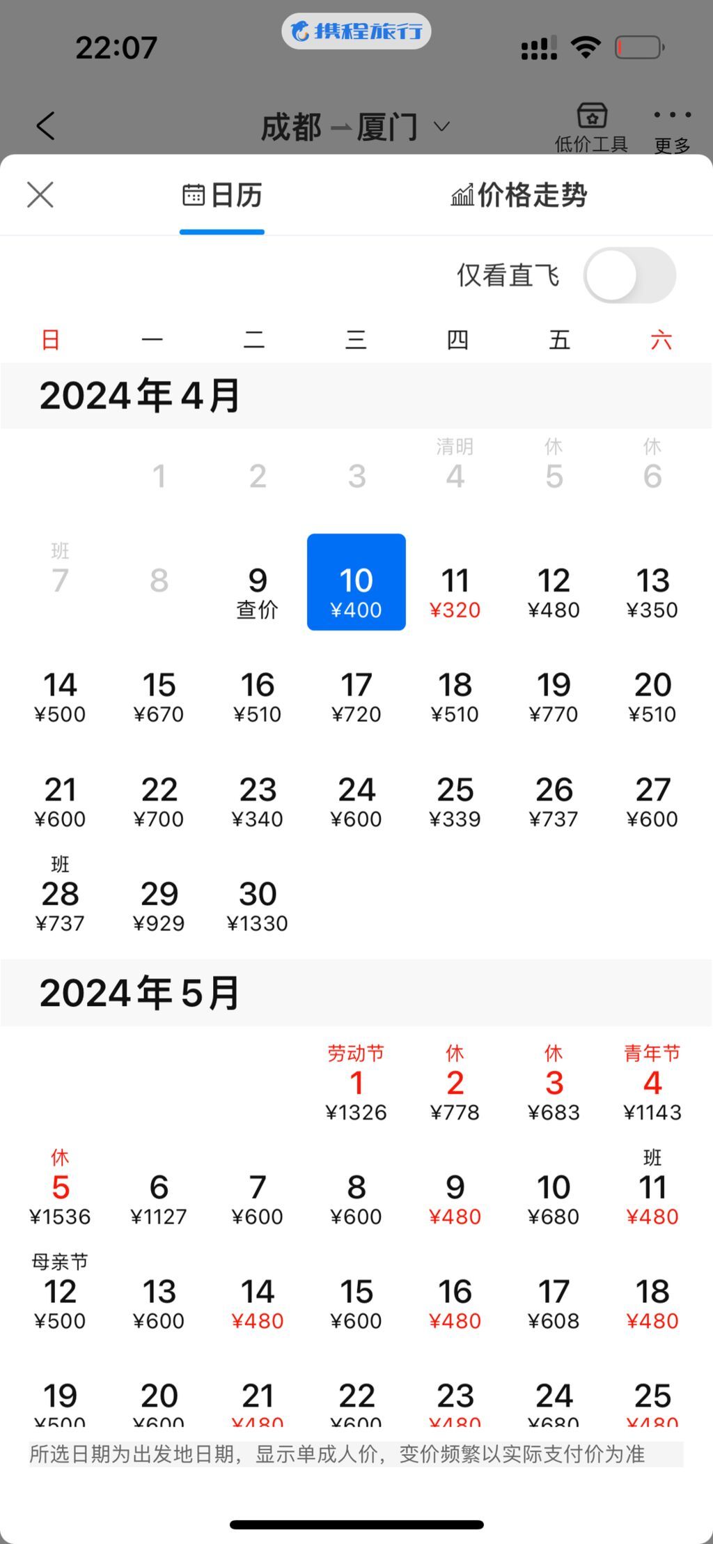 厦门作为旅游热门航空目的地之一,也出现了较高涨幅。市民周女士表示自己想要提前预订成都到厦门的旅程,在预订机票时,周女士发现,在某OTA平台上,成都飞往厦门的特价机票4月9日为400元起,而“五一”假期前一天价格则为1326元,差价在3.3倍。