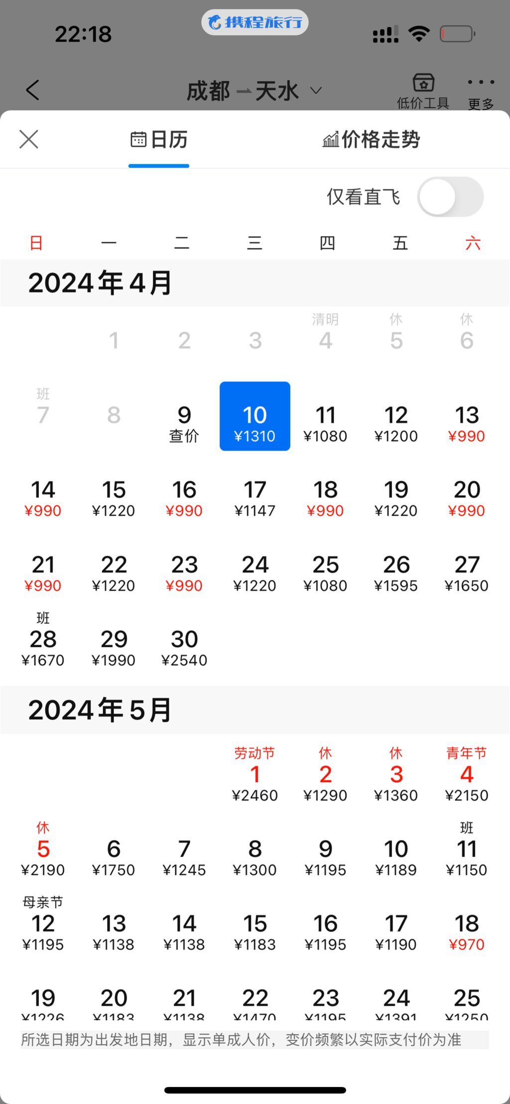 此外,另一大热门的旅游目的地天水也吸引了众多游客的目光。尽管成都至天水之间没有直飞航班,但“五一”假期的临近使得机票价格水涨船高。原本价格为1310元的机票,在“五一”假期前已经翻倍,涨至2460元,显示出成都市民们对于旅游的热情与期待。