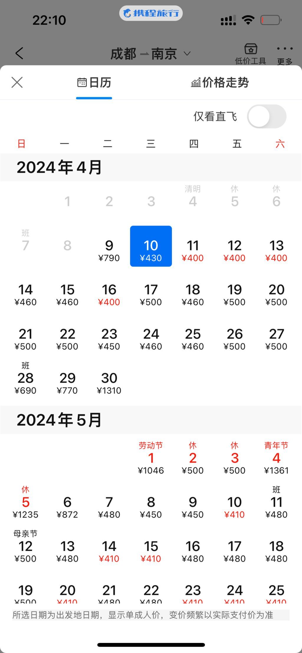 记者注意到,4月29日至5月5日,从成都至南京的机票价格涨幅较大,4月10日至13日机票价格最低,均为400元,与5月5日最高价1235元相比,差价在3.08倍。