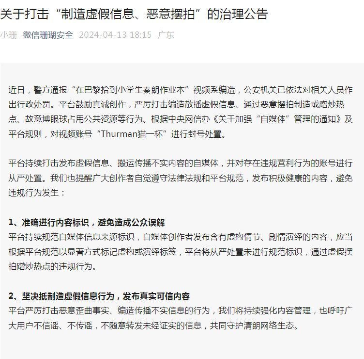 去年,中央网信办曾发布《关于加强“自媒体”管理的通知》,尤其提到这类现象——“自媒体”发布含有虚构情节、剧情演绎的内容,网站平台应当要求其以显著方式标记虚构或演绎标签。鼓励网站平台对存在争议的信息标记争议标签,并对相关信息限流。