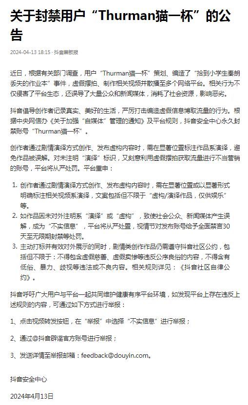 同日,“抖音黑板报”发布《关于封禁用户“Thurman猫一杯”的公告》,表示已将账号“Thurman猫一杯”永久封禁。