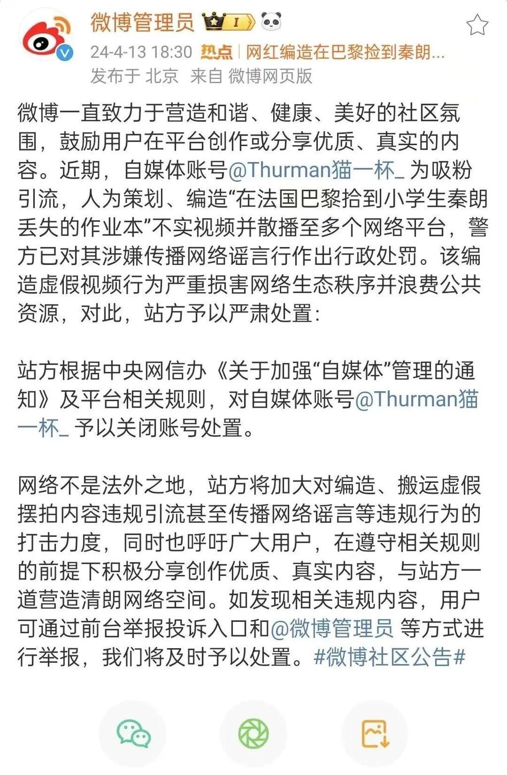 截至目前,自媒体博主猫一杯多平台账号已被封禁。4月13日下午,微信、微博官方账号发布公告,称对视频账号“Thurman猫一杯”进行封号处置。