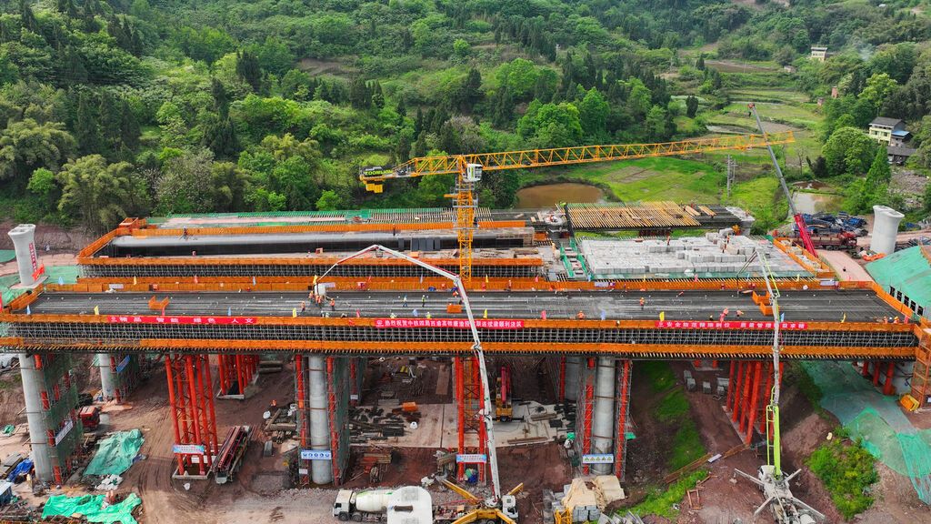 4月14日,西渝高铁达州南站2号八线特大桥施工现场,随着最后一方混凝土浇筑,西渝高铁康渝段首个连续梁完工,为全线后续连续梁施工奠定基础。