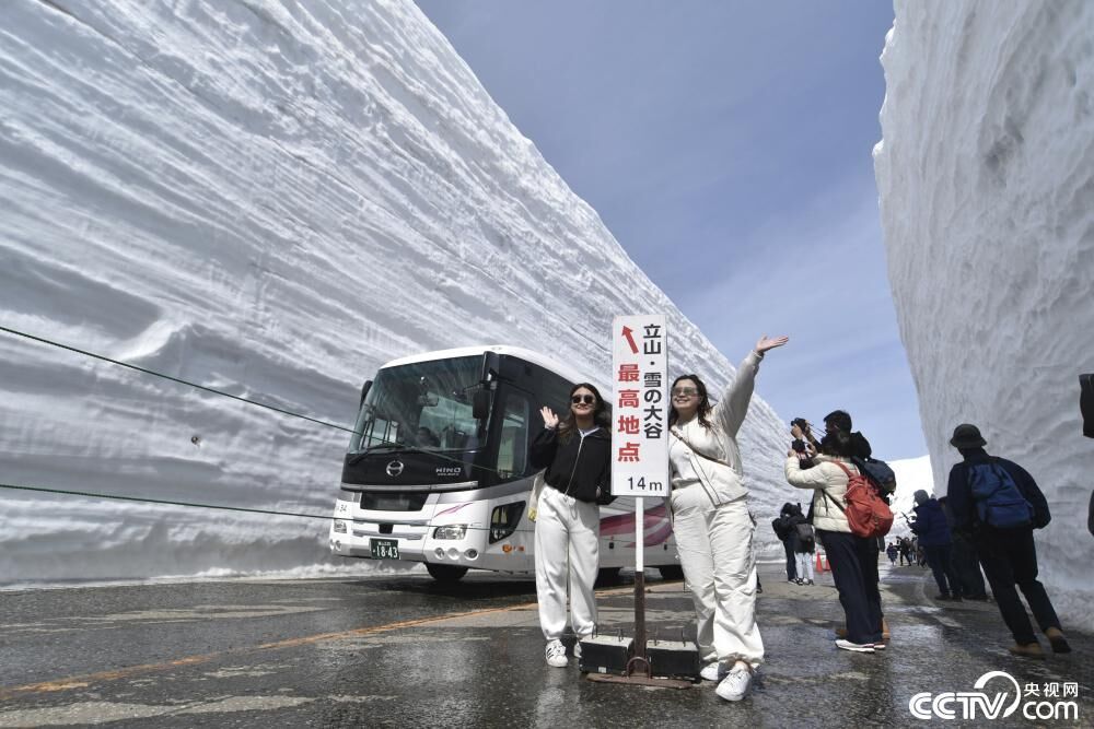 当地时间2024年4月15日,日本富山县立山町,日本著名的“雪墙公路”对公众开放,两侧积雪高达14米,吸引大批游客。