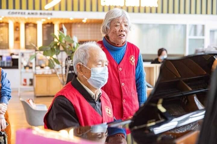 15日,在浙江台州恩泽医院门诊大厅,患者们步履匆匆,神情严肃。大厅角落里,一位头发花白、精神矍铄的老人端坐在钢琴前弹奏,悠扬的乐声吸引不少患者驻足欣赏。