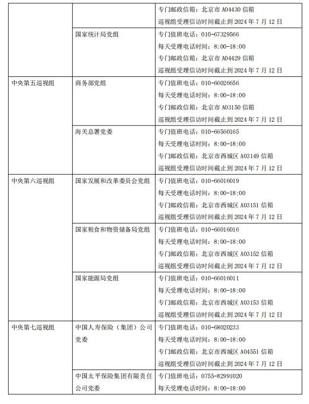 据了解,15个中央巡视组将在被巡视单位工作3个月左右,巡视期间设立专门值班电话和邮政信箱,受理干部群众的来信来电来访。巡视组每天受理电话的时间为8:00至18:00,受理信访时间截止到2024年7月12日。