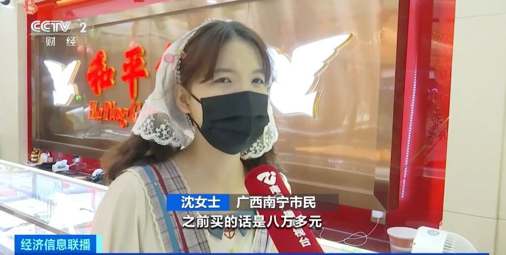 在广西南宁,黄金首饰店内摆放着琳琅满目的黄金饰品,不少顾客前来选购,还有的顾客拿着旧的黄金首饰来变现。南宁市民沈女士三年前在黄金价格低点时买入了金条,现在她选择果断出手。