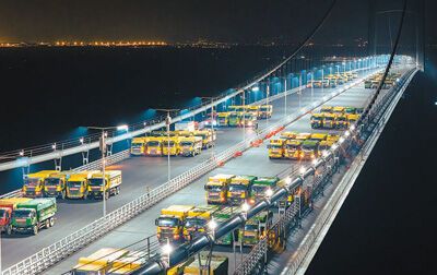 人民日报北京4月18日电 (记者韩鑫)17日晚,经过136辆总重约5000吨的大货车组重压测试,由中交二航局参建的深中通道伶仃洋大桥完成动静载试验,这是世界首次在全离岸海中超大跨径悬索桥上完成的荷载试验。