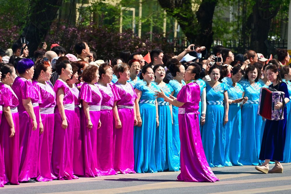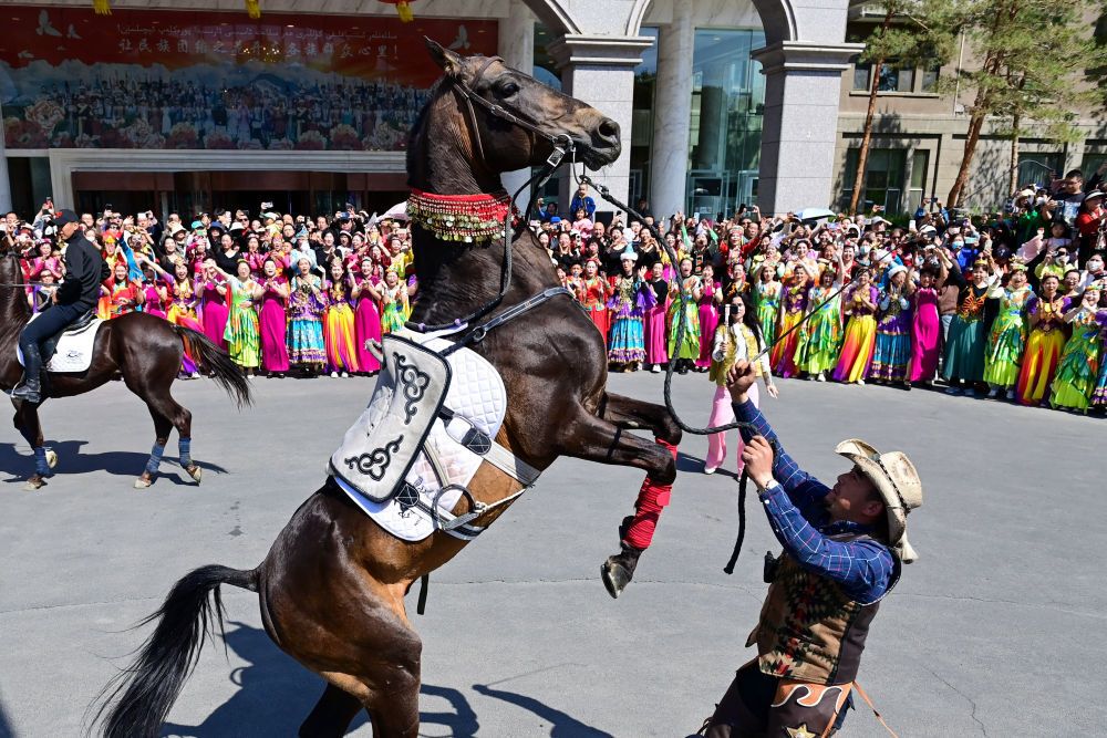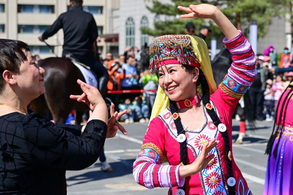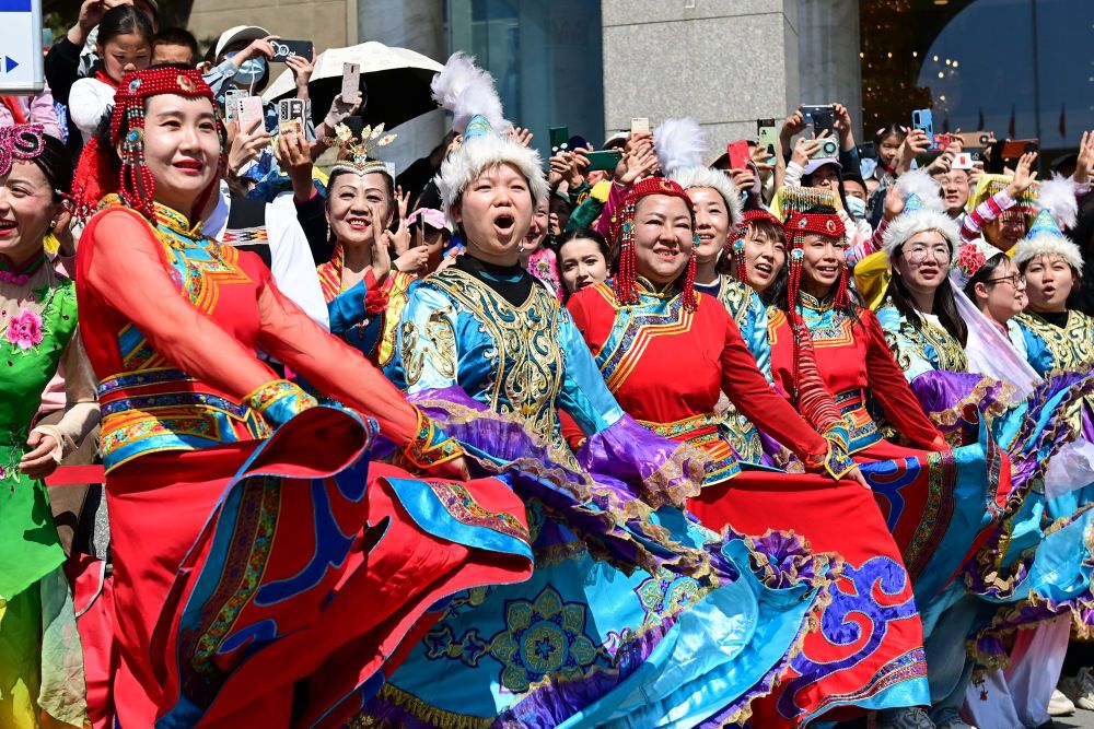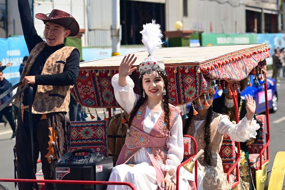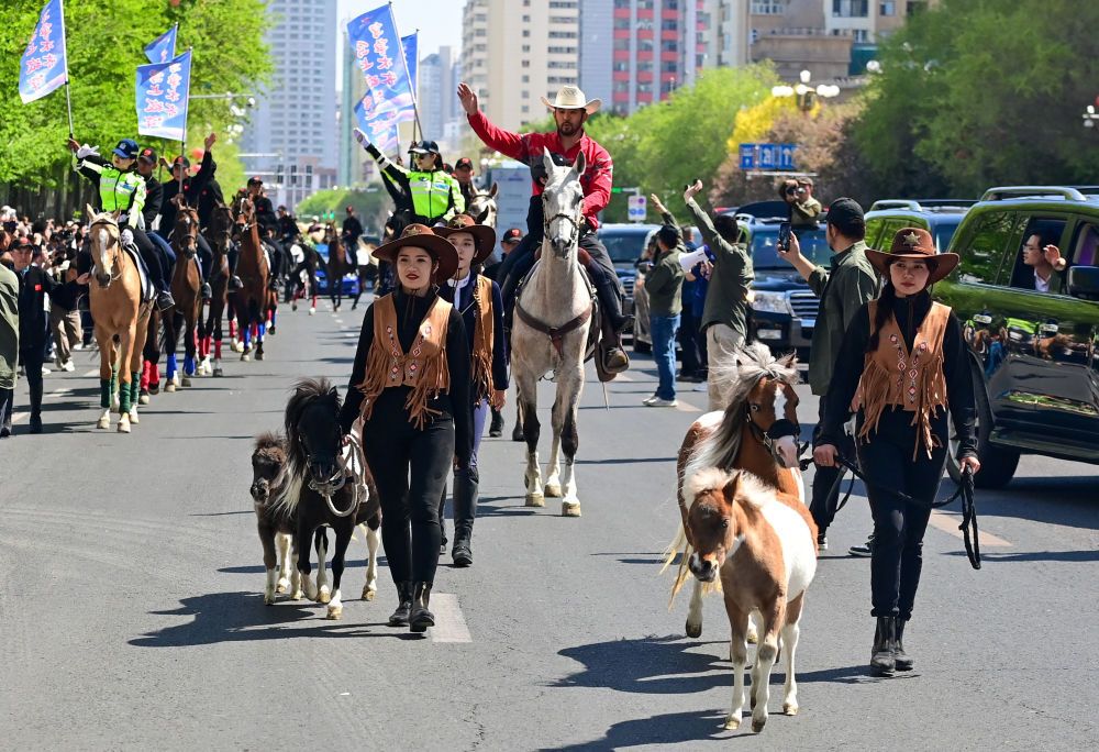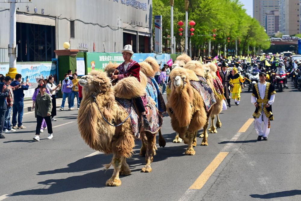 4月30日,一支庞大的巡游队伍亮相新疆乌鲁木齐市友好商圈。作为“五一”文化展演活动的一部分,乌鲁木齐市通过马队、驼队、花车等巡游的方式,展示城市的发展活力和独特魅力。新华社记者 丁磊 摄影报道