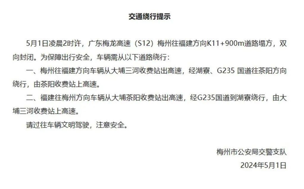 梅州市以及大埔县公安、应急、消防、卫健等相关部门赶赴现场开展救援。目前,梅大高速双方向车道已全部封闭,车辆需注意绕行。
