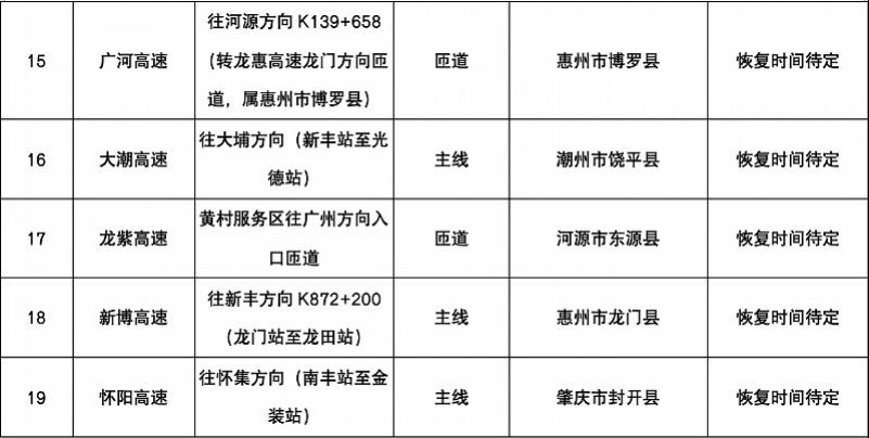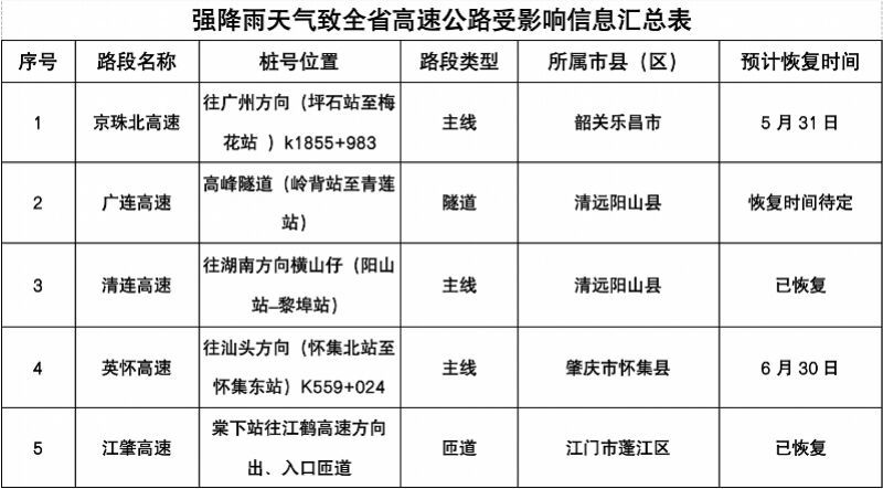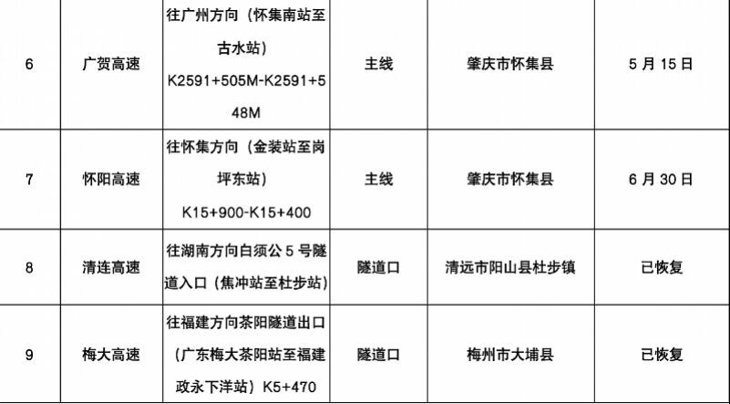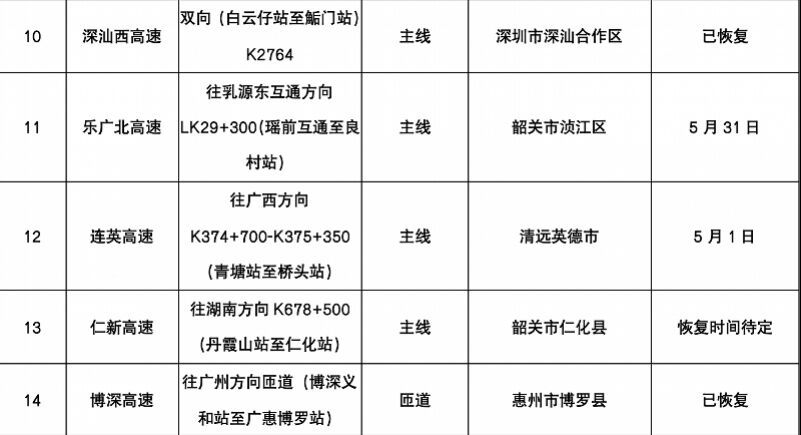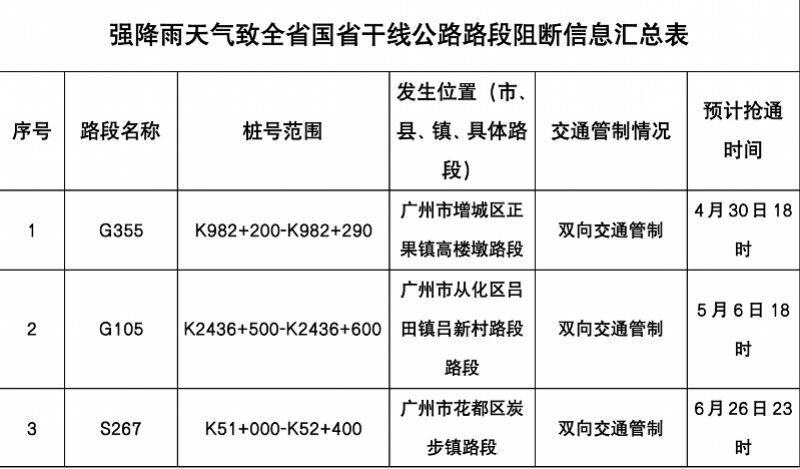 记者从广东省交通运输厅获悉,近期,受持续性强降雨影响,广东部分地区高速公路、普通国省道受损。截至4月30日16时,高速公路受影响路段共计19处,已恢复6处,剩余13处封闭部分车道;普通国省道受影响路段剩余9处仍处于双向交通管制状态。